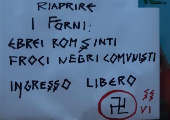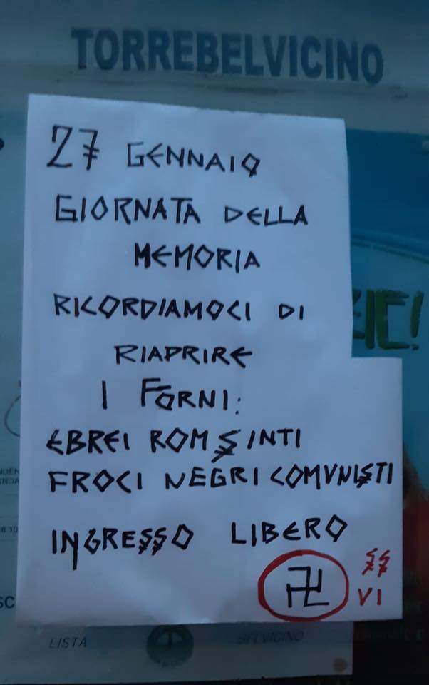 L’immagine sta facendo il giro dei social. Il volantino è stato affisso nella notte tra il 27 ed il 28 gennaio con il simbolo della svastica questa scritta: “Ricordiamoci di riaprire i forni: ebrei, rom, sinti, froci, negri, comunisti. Ingresso libero”.