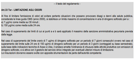 Nel corso dell’ultimo consiglio comunale, per la prima volta in Italia, è stata approvata la prima regolamentazione comunale in materia di LIMITAZIONE AGLI ODORI, attraverso l’utilizzo dei limiti di concentrazione in aria dell’idrogeno solforato indicati daal’Organizzazione Mondiale della Sanità.
