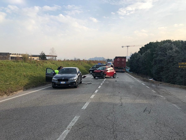 Incidente stradale ad Arzignano intorno alle 14.30, in via Montorso (provinciale per Montorso) all’altezza dell’intersezione con via Marche. Coinvolti 4 veicoli: una Mini Cooper condotta da M. B. ragazzo 20enne di Arzignano, una Fiat 500 condotta da P.D. ragazza 22enne di Montebello, una BMW condotta da B.A, donna 33enne di Zermeghedo (nell’auto anche un neonato di soli 20 giorni) e un camion condotto da un autista sloveno.