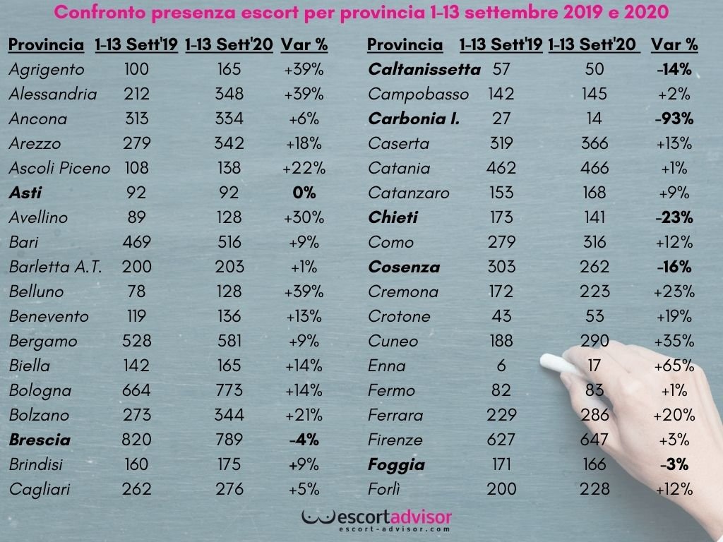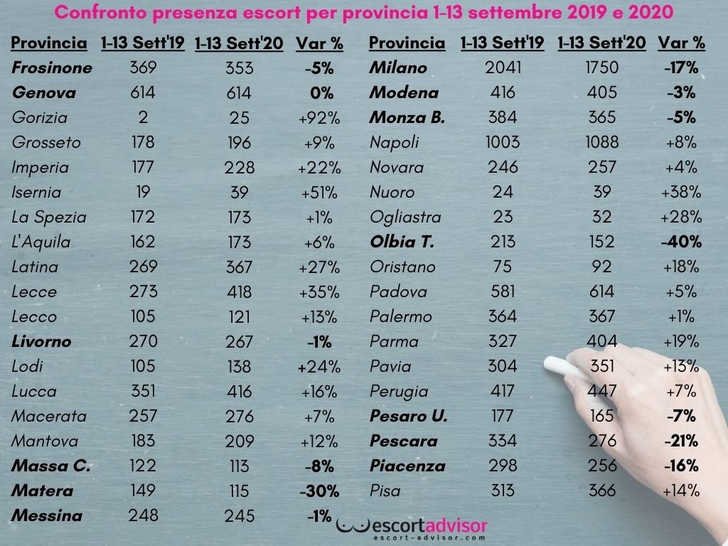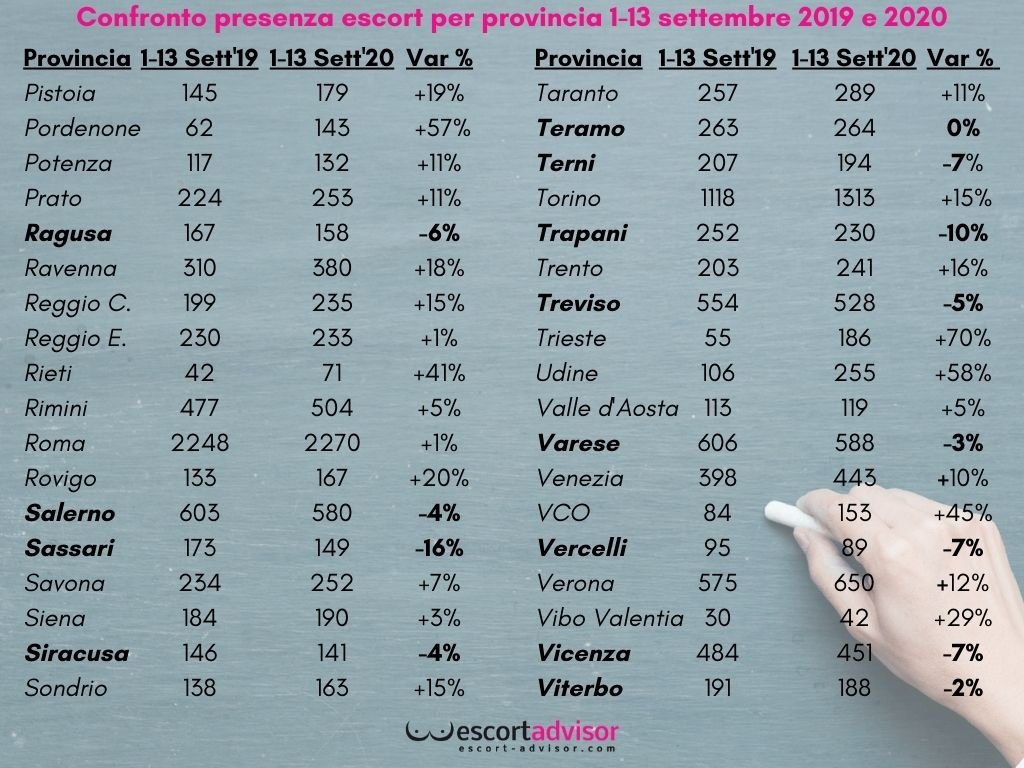 Le 10 province che registrano un aumento di presenza di escort rispetto al periodo che va dall’1 al 13 settembre del 2019 con lo stesso del 2020 sono: Gorizia (+92%), Trieste (+70%), Enna (+65%), Udine (+58%), Pordenone (+57%), Isernia (+51%), Verbano-Cusio-Ossola (+45%), Rieti (+42%), Agrigento, Alessandria, Belluno a pari merito (+39%), Nuoro (+38%).