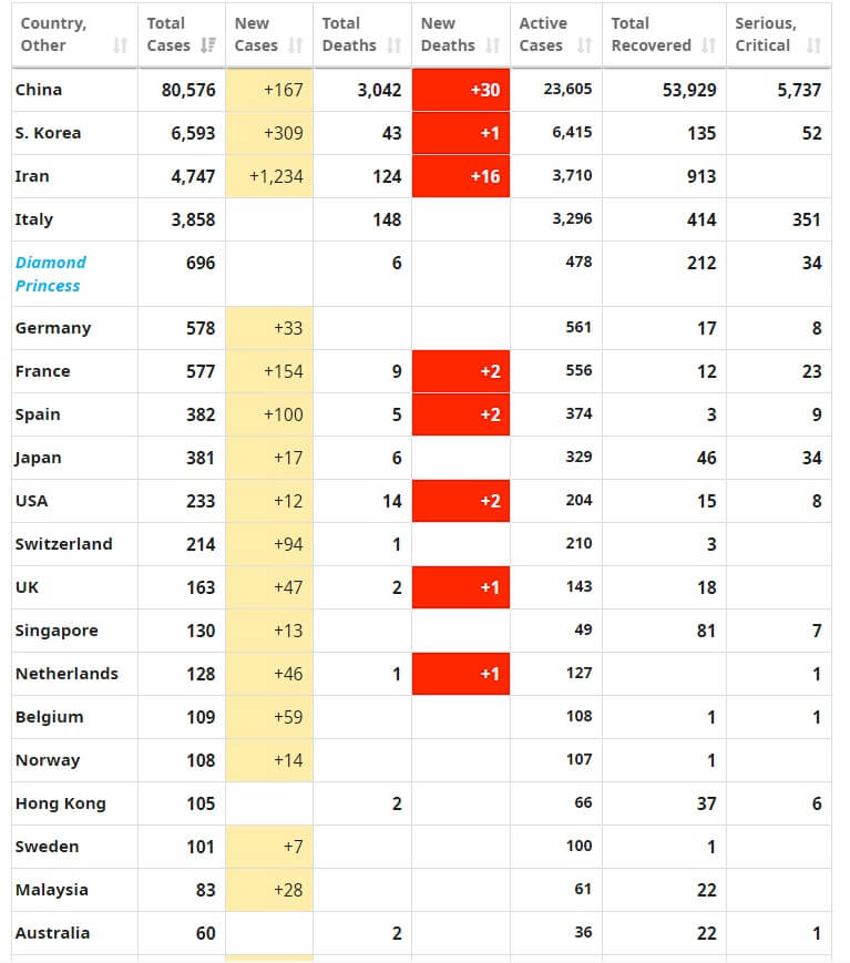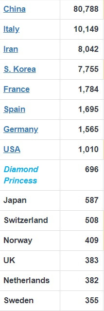 H 9 — Secondo gli ultimi dati morti nel mondo causate dal coronavirus sono 3.038, con l’infezione estesa ormai a 65 Paesi: di cui il totale in Cina a 2.912. I contagiati sono quasi 90 mila, ma come è ormai chiaro a tutti i dati sono assolutamente distorti e limitati, considerando che in molti Paesi il sistema sanitario è assolutamente incapace anche solo di ‘sondare’ la malattia.