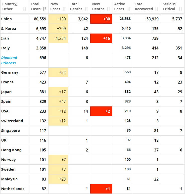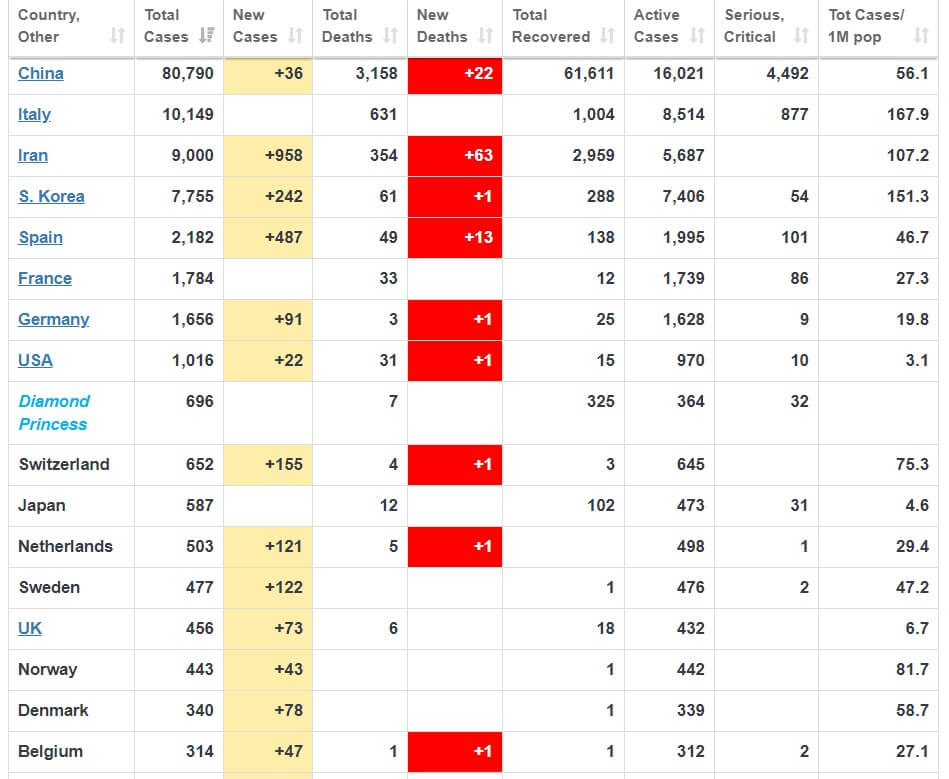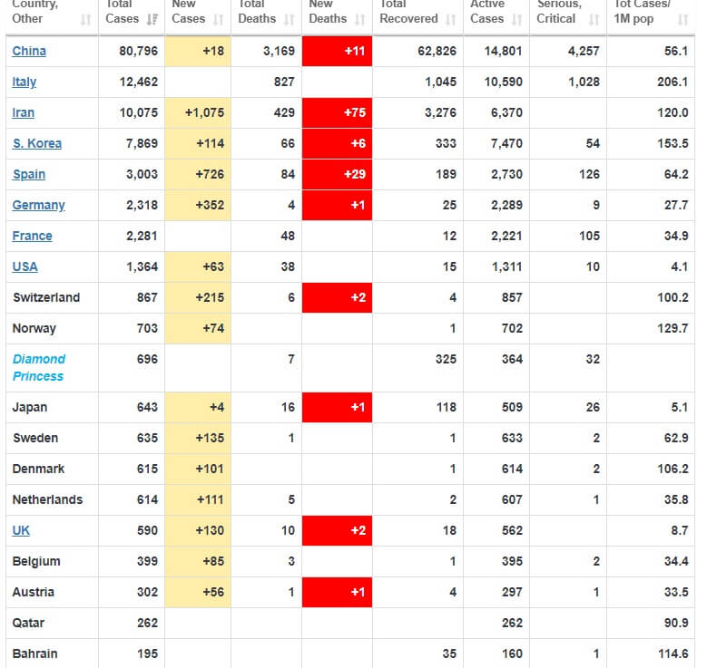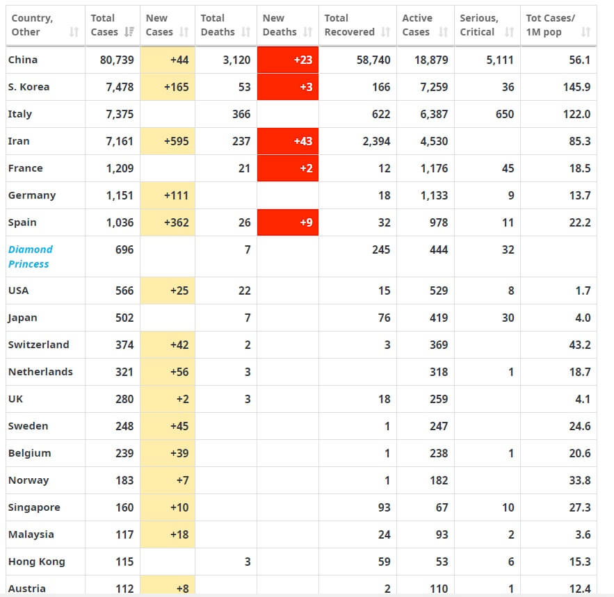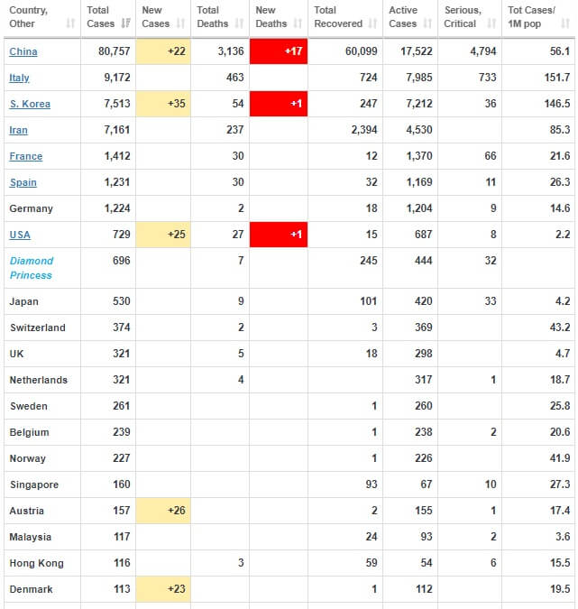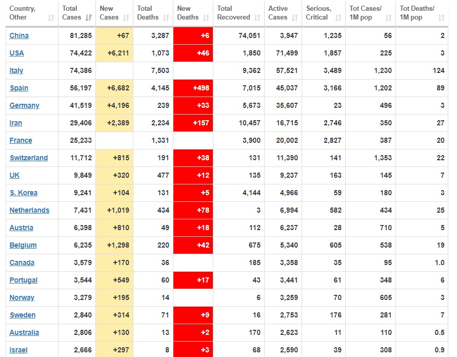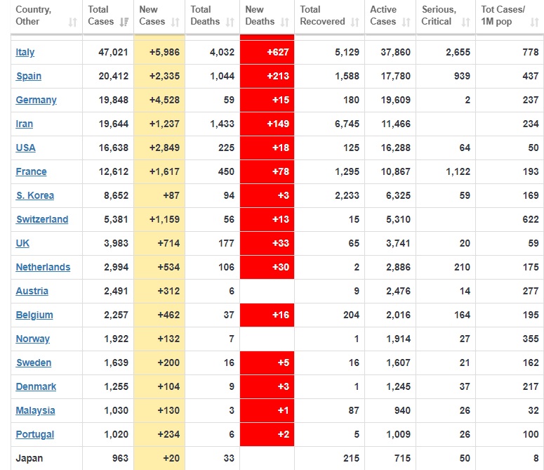 Discorso a parte meritano gli USA, dove fino a venerdì erano stati effettuati poco meno di 2000 tamponi e dove solo ora si comincia a prendere sul serio la diffusione del coronavirus. I casi accertati sono 554, ma in netto aumento, praticamente in tutti gli stati.