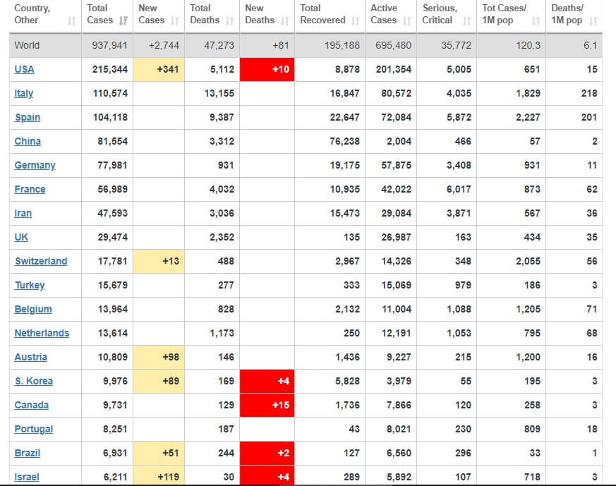 ECCO LA TABELLA DEI CONTAGI NEL MONDO AGGIORNATA ALLE 16.19