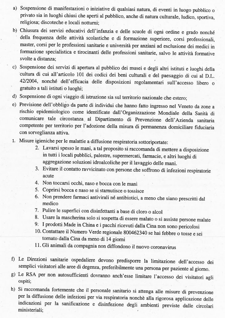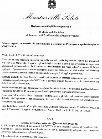 La Regione Veneto e il Ministero della Salute hanno diramato in serata l’ordinanza ufficiale di CHIUSURA di EVENTI E MANIFESTAZIONI sia in LUOGO PUBBLICO CHE PRIVATO, MERCATI, IMPIANTI SPORTIVI, CHIESE, DISCOTECHE, SCUOLE, BIBLIOTECHE MUSEI, fino al 1° MARZO COMPRESO.