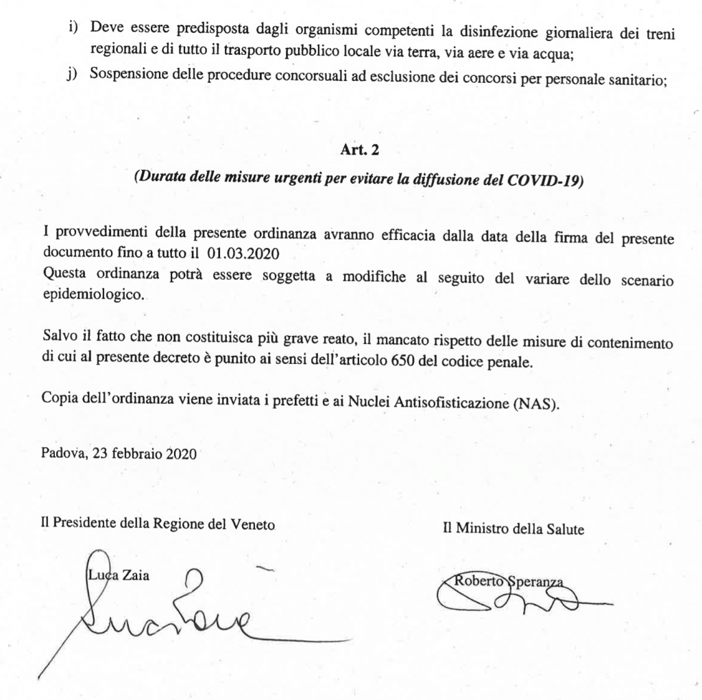 Coronavirus in Veneto, l’Ordinanza di Zaia