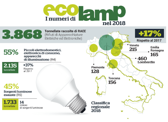 Sono 3.868 le tonnellate di RAEE – Rifiuti di Apparecchiature Elettriche ed Elettroniche – raccolte da Ecolamp nel 2018, con un incremento del 17% rispetto allo scorso anno. I piccoli elettrodomestici, l’elettronica di consumo e gli apparecchi di illuminazione (R4) costituiscono il 55% della raccolta, mentre il 45% è composto da sorgenti luminose esauste (R5).