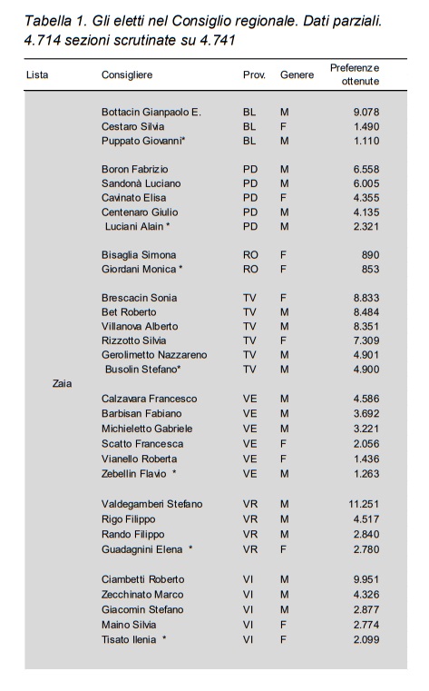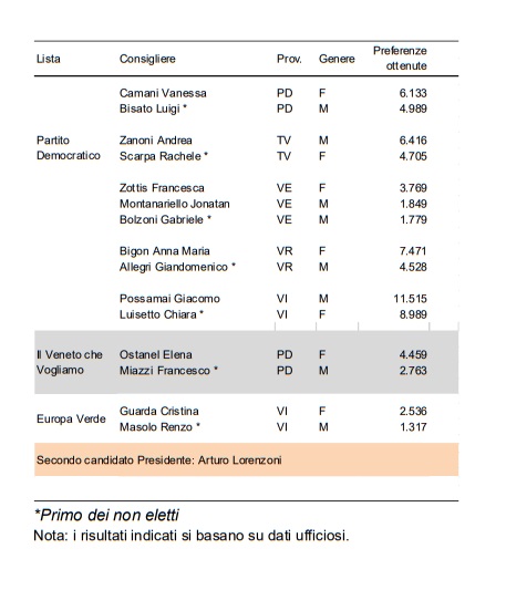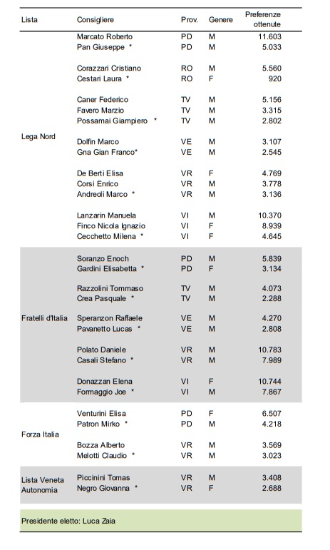 Ecco le stime della Regione, quando mancano 27 sezioni. Sicuramente eletti i candidati citati nel titolo. I candidati con asterisco sono i primi dei non eletti, che potranno entrare in consiglio se qualche eletto diventerà assessore. Per esempio, nel Vicentino, l’ex sindaco di Montecchio Maggiore Milena Cecchetto per la Lega, se Lanzarin o Finco saranno nominati assessori o in Fratelli d’Italia, Joe Formaggio (ex sindaco di Albettone) se Donazzan diventerà assessore, come pure Tisato in Lista Zaia. Lo stesso vale per le altre province. Dati in aggiornamento