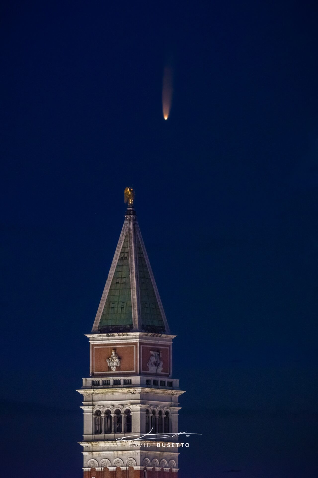 Una di quelle che sta facendo il giro del web nelle ultime ore è ad opera di Davide Busetti, che sulla sua bacheca pubblica una foto straordinaria con questa breve didascalia: ore 3_30 di questa mattina, la cometa C/2020F3 Neowise sopra il campanile di San Marco a Venezia.