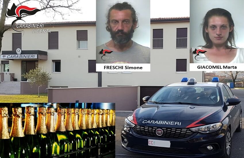 Nella serata di sabato 11 luglio 2020, i Carabinieri della Tenenza di Montecchio Maggiore hanno, durante un servizio di perlustrazione, arrestato due cittadini italiani per furto aggravato di 12 bottiglie di Champagne per il valore di 593,00 Euro, avvenuto all’interno dell’ipermercato “Tosano” di via Trieste 51 di Montecchio Maggiore (VI).
