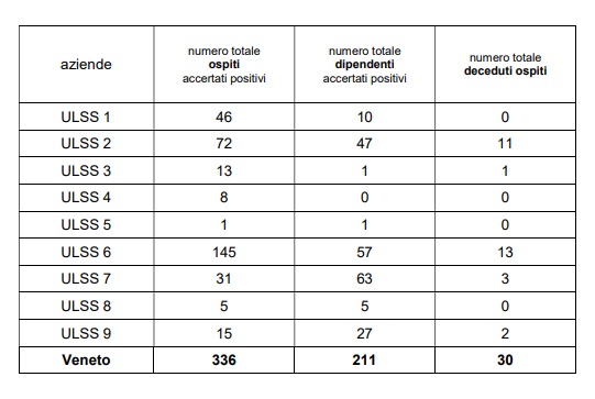 Al momento, gli ospiti positivi al coronavirus sono 336 e quelli purtroppo deceduti sono 30. I dipendenti positivi sono invece 211. La tabella è stata diffusa oggi dalla Regione Veneto