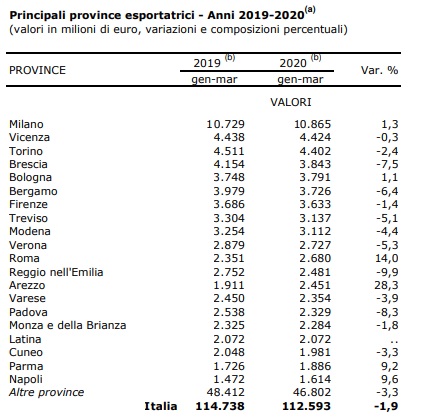 In un primo trimestre del 2020 condizionato in parte dall’inizio della pandemia Covid-19 Vicenza per la prima volta supera Torino nelle esportazioni ed è ora seconda solo a Milano (fonte Istat – Coeweb).