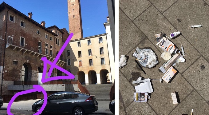 Mentre la città festeggia giustamente i grandi numeri della mostra di Van Gogh, a pochi passi dalla Basilica, anzi, sotto la Basilica, va in scena il degrado. Siringhe, scatole di medicinali e pacchetti di sigarette abbandonati. La segnalazione ci arriva da una lettrice residente in zona, che preferisce rimanere anomina (ci racconta che i residenti in zona si trovano spesso le automobili rigate e preferisce non correre rischi). La donna, dopo averci inviato alcune foto scattate a contrà Catena, ci racconta che alle 7 di mattina il suo compagno aveva trovato il cumulo di rifiuti e gliel’aveva segnalato. Tutto questo in pieno centro, a pochi metri dall’ingresso della mostra e soprattutto sotto l’occhio, forse disattento, delle telecamere. Uscita per lavoro e rientrata a mezzogiorno, ha trovato esattamente la stessa situazione documentata dal compagno qualche ora prima.