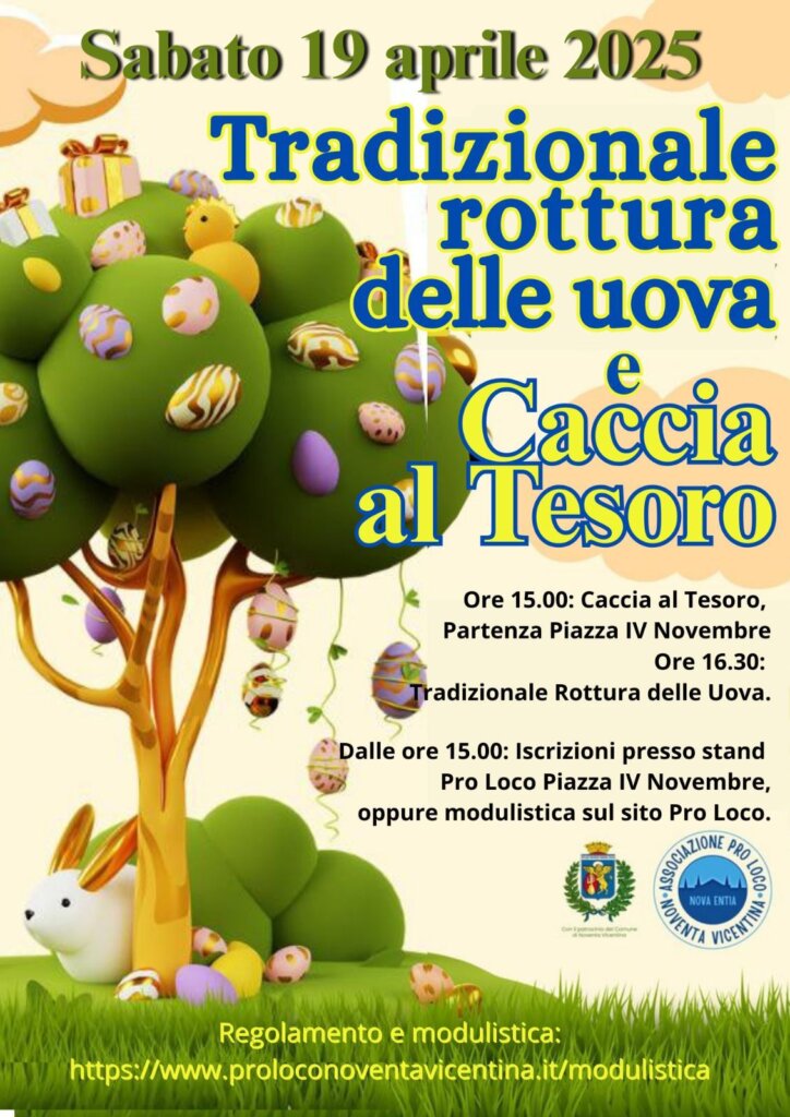 “La Rottura delle Uova è una delle tradizioni più sentite e genuine di Noventa Vicentina, un momento che ogni anno sa unire le generazioni e rafforzare il nostro senso di comunità” dichiara il sindaco Mattia Veronese. “È bello vedere come, attorno a un gesto semplice e antico, si rinnovi lo spirito di condivisione che da sempre contraddistingue il nostro paese. Invito tutti a partecipare sabato 19 aprile a questo pomeriggio di festa in Piazza IV Novembre. La caccia al tesoro e la tradizionale gara delle uova saranno l’occasione perfetta per divertirsi insieme e scambiarsi un augurio di Pasqua all’insegna della serenità e dell’amicizia. Vi aspettiamo numerosi, con il sorriso e, perché no, con un uovo da difendere fino all’ultima crepa!”.