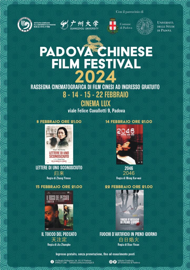 L’evento offre spazio alla cinematografia cinese con quattro serate di proiezioni di film cinesi a ingresso libero presso il Cinema Lux di Padova. L’ingresso in sala sarà garantito fino a esaurimento dei posti. Le proiezioni inizieranno alle ore 21.00.