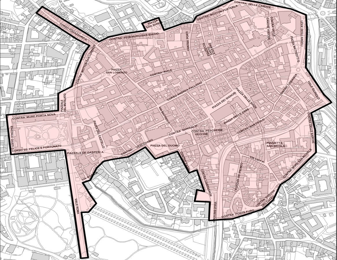 Nello specifico, il perimetro dell’area interessata dal provvedimento è costituito da piazzale De Gasperi, corso Ss. Felice e Fortunato, piazzale Giusti, contra’ Mure Porta Nova, piazzale del Mutilato, contra’ Motton San Lorenzo, corso Fogazzaro, contra’ Pedemuro San Biagio, piazza San Biagio, contra’ Motton Pusterla, contra’ delle Canove, Levà degli Angeli, viale Giuriolo, contra’ delle Barche, contra’ Mure San Michele, contra’ Porton del Luzzo, contra’ Ponte Furo, viale Eretenio, contra’ Carpagnon, contra’ Pasini, piazza del Duomo, contra’ Vescovado, viale Gorizia e viale Roma, compresa l’esedra di Campo Marzo.