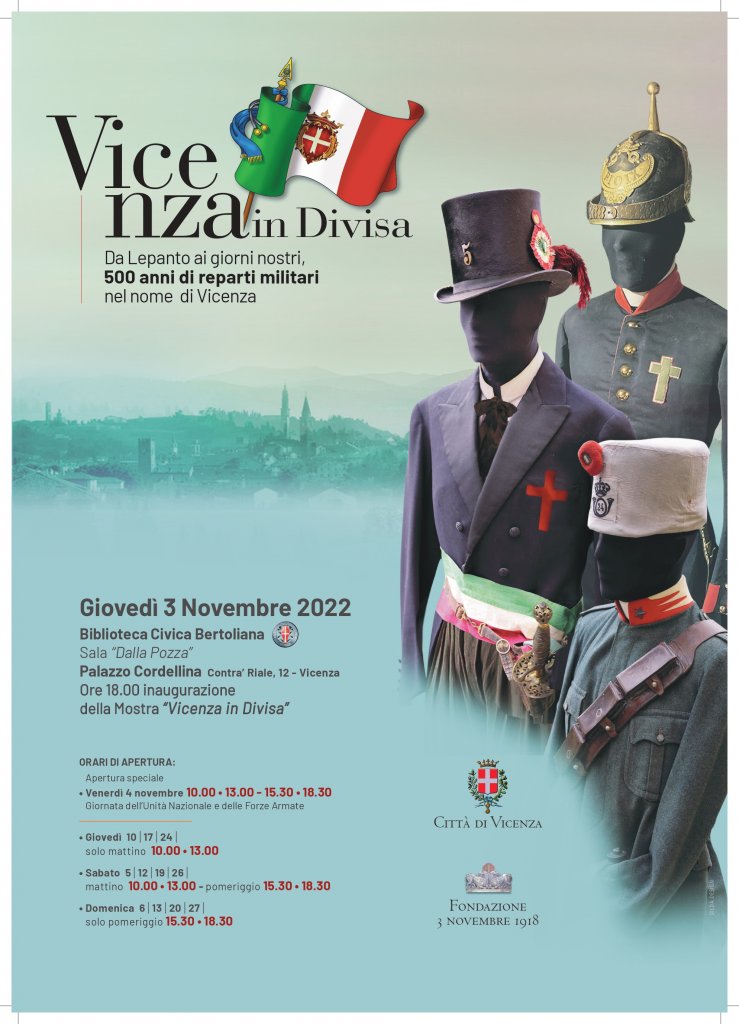 La mostra “Vicenza in divisa. Da Lepanto ai giorni nostri, 500 anni di reparti militari nel nome di Vicenza” verrà inaugurata giovedì 3 novembre alle 18 a Palazzo Cordellina, sede della Biblioteca civica Bertoliana.