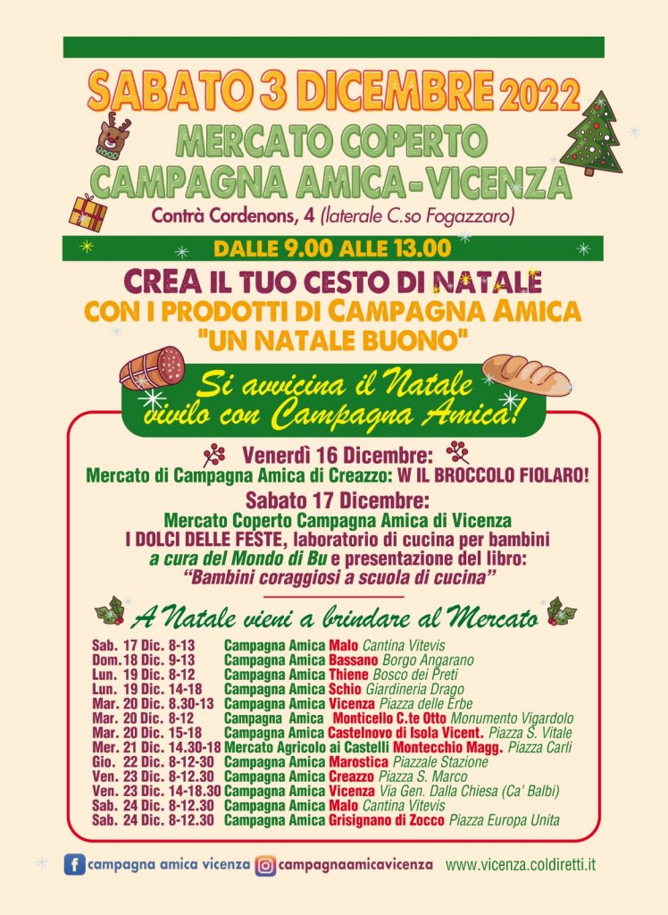 Sabato 17 dicembre, invece, al mercato coperto di Campagna Amica Vicenza, in contra’ Cordenons 4 a Vicenza, verrà proposto un divertente ed istruttivo laboratorio di cucina per bambini: “I dolci delle feste”, a cura del Mondo di Bu e, con l’occasione, verrà presentato il libro “Bambini coraggiosi a scuola di cucina”.