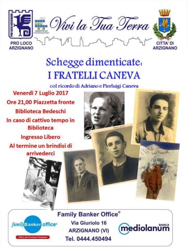 Venerdì alle ore 21 nella piazzetta di fronte alla Biblioteca Bedeschi, la Pro Loco di Arzignano, in collaborazione col Comune di Arzignano, ripercorrerà una storia drammatica e a lungo dimenticata: quella dei Fratelli Caneva. Due di loro, Amleto ed Igino, morirono in un campo di concentramento in Germania mentre Sergio, Jertha, Lino rischiarono la vita durante la Resistenza. Verranno raccontate le loro storie e il territorio dopo l’8 Settembre 1943 anche grazie alle testimonianze dirette dei fratelli Adriano e Pierluigi. Questo evento è uno dei 4 progetti inseriti nell’Alternanza Scuola Lavoro che anche quest’anno la Pro Loco di Arzignano svolge con il Liceo Da Vinci di Arzignano. Al termine un piccolo brindisi.