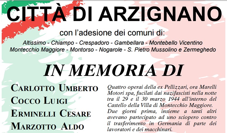 Alle ore 9.15 si terrà un incontro delle Autorità con i ragazzi delle scuole di Montecchio Maggiore al Castello della Villa o “di Romeo”. Dopo la deposizione della corona alla lapide ai caduti, gli studenti dell’ITT Meccanica – Meccatronica dell’Istituto “Silvio Ceccato” di Montecchio Maggiore ricostruiranno l’evento dei quattro operai della Marelli. Seguiranno gli interventi di rappresentanti dell’Amministrazione Comunale di Montecchio Maggiore e dell’ANPI;