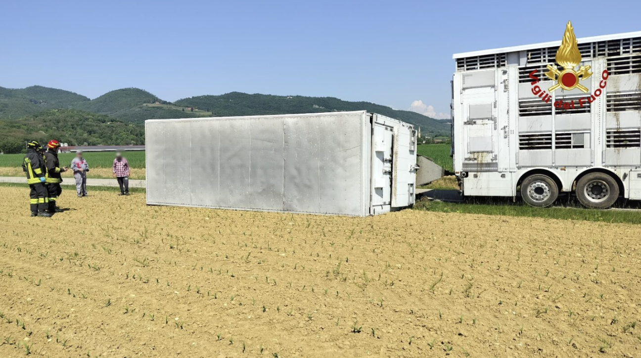 Basso Vicentino – Camion rimorchio carico di bovini si rovescia in un campo (FOTO)
