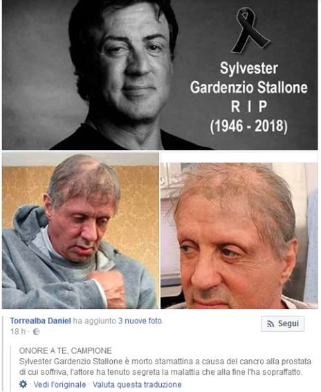 “Sylvester Gardenzio Stallone è morto stamattina a causa del cancro alla prostata di cui soffriva, l’attore ha tenuto segreta la malattia che alla fine l’ha sopraffatto”. La notizia fa velocemente il giro dei social stamattina, tra commenti disperati dei fans dell’ex Rambo. Ma per fortuna è una fake news.