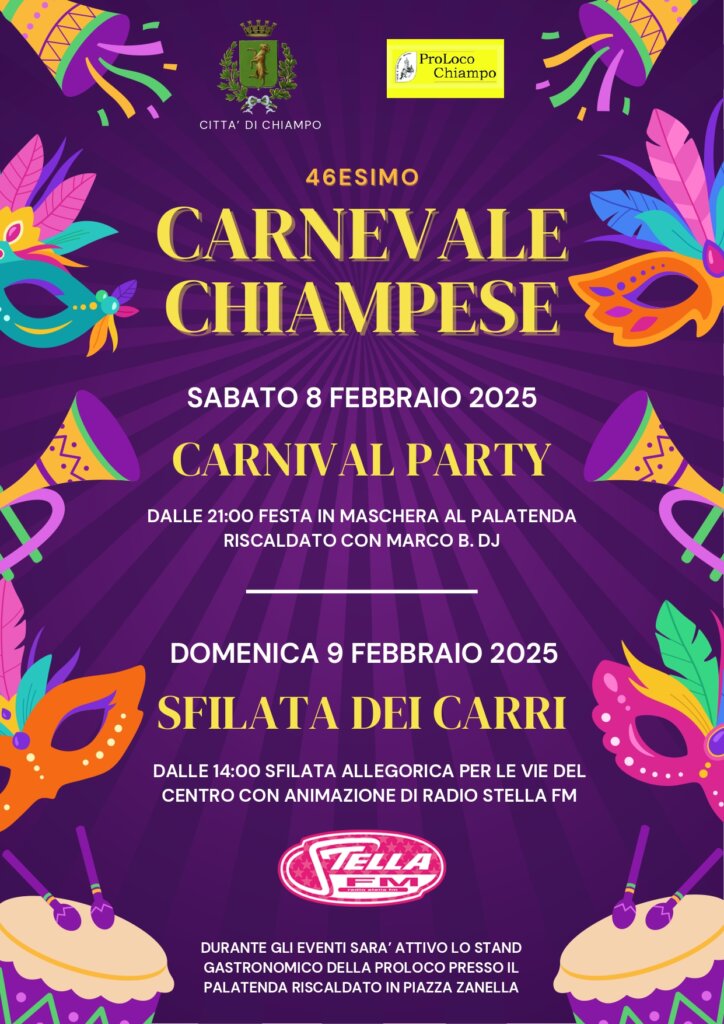Chiampo si prepara a scendere in piazza per festeggiare uno degli eventi più attesi dell’anno: il Carnevale Chiampese. Giunto alla sua 46ª edizione, questo evento promette di essere più divertente e colorato che mai! Due giorni di festa. Il programma è ricco di appuntamenti per tutti i gusti