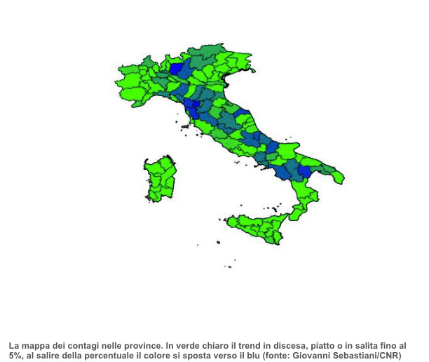 Circa un quinto delle 107 province italiane mostra di avere una tendenza alla crescita del numero di nuovi casi al giorno (incidenza) di positivi al SarsCov-2 nelle ultime tre settimane. E’ quanto emerge dall’analisi delle curve relative al numero di nuovi positivi registrati ogni giorno a livello provinciale eseguita dal matematico Giovanni Sebastiani, dell’Istituto per le Applicazioni del Calcolo ‘Mauro Picone’ del Consiglio Nazionale delle Ricerche (Cnr-Iac).