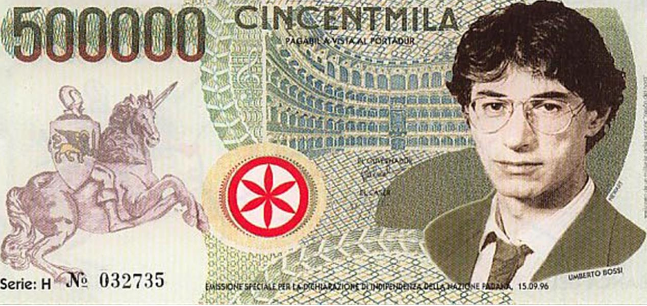 Caratteristica una banconota da “Cincentmila” lire, riportante l’effigie di un giovane Bossi, oltre all’onnipresente Sole delle Alpi.