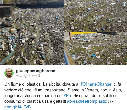 Un fiume di plastica. La siccità, dovuta al #ClimateChange, ci fa vedere ciò che i fiumi trasportano. Siamo in Veneto, non in Asia, lungo una chiusa nel bacino del #Po. Il Po, il grande fiume, versa in uno stato davvero pietoso: è secco come se già fossimo in piena estate e in più, in alcuni punti, il suo letto è una vera e propria distesa di rifiuti di plastica.Sostanzialmente c’è un grave stato di siccità, ancora più serio di quello che solitamente si registra in piena estate ma ciò non basta. Là dove il fiume è completamente secco e rimane solo il letto si nota un pesante accumulo di oggetti di ogni tipo, ovviamente di plastica.
