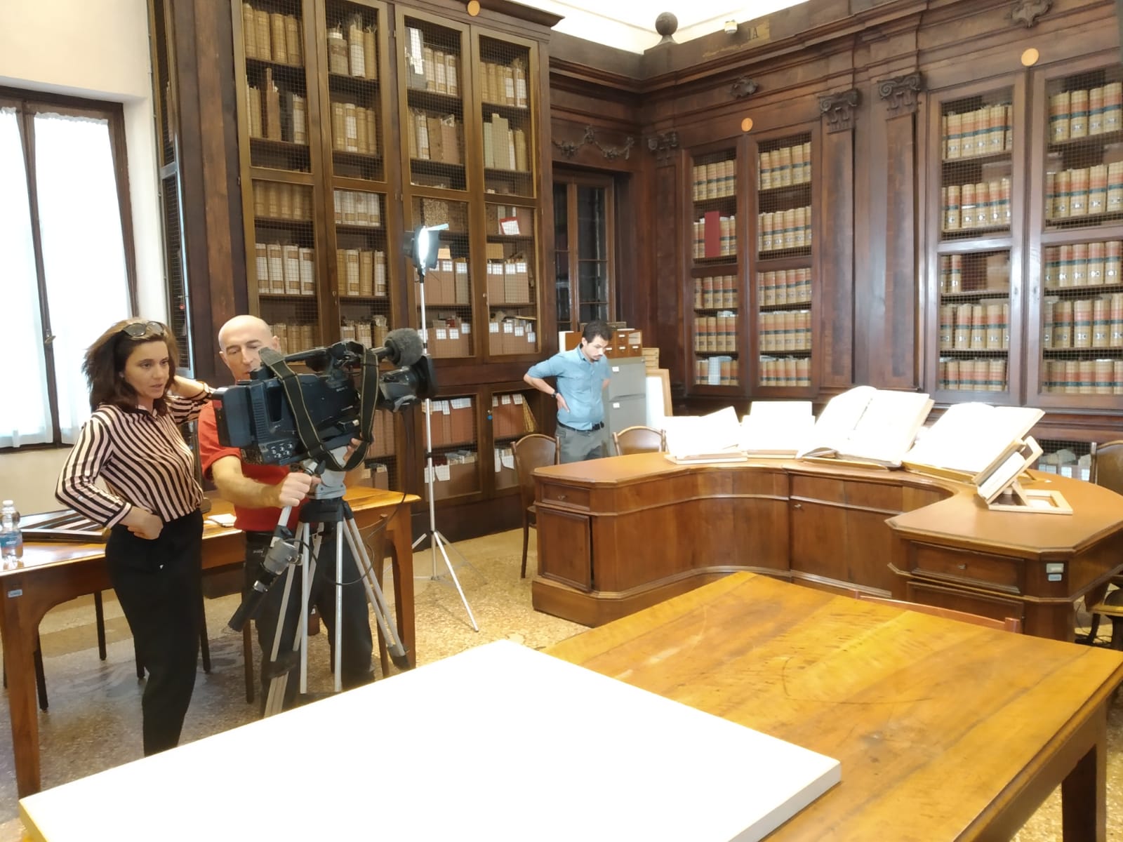 Nella visita alla biblioteca, durata oltre quattro ore e coadiuvata da Mattea Gazzola, responsabile dei fondi antichi e degli archivi, le telecamere della Rai hanno ripreso altri pezzi pregevoli della Bertoliana: il planisfero manoscritto del cartografo veneziano Giovanni Leardo (1448), la pianta di Vicenza cosiddetta del Peronio del 1480, l’incunabolo della “Geografia” di Tolomeo, stampata a Roma nel 1490, il volume “Paesi nouamente retrouati” dedicato ai viaggi di Amerigo Vespucci e pubblicato proprio a Vicenza nel 1507, la “Cosmographia” di Pietro Appiano del 1540, il volume “Navigazioni e viaggio di Giovanni Battista Ramusio” risalente al 1554, lo splendido “Theatrum orbis terrarum” di Ortelio, pubblicato ad Anversa nel 1592 e infine il Portolano di Placido Caloiro.