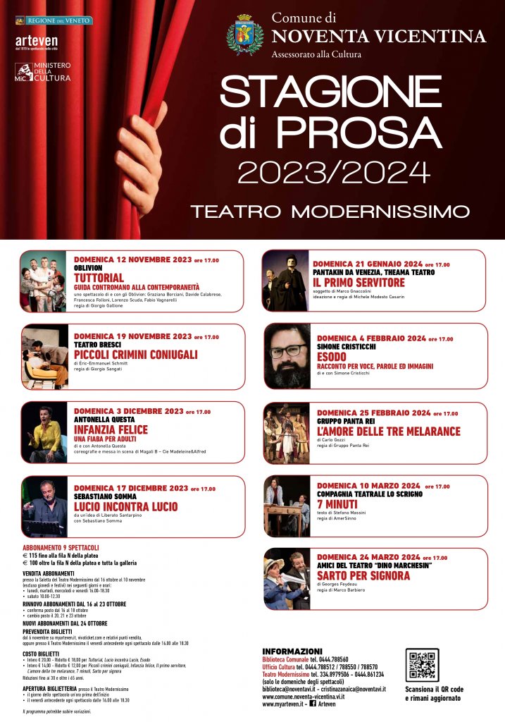 Al nastro di partenza la stagione 2023/2024 di Noventa Vicentina, con tredici appuntamenti per grandi e piccini che accompagneranno gli spettatori del Teatro Modernissimo da novembre a marzo. La rassegna domenicale è organizzata dall’Assessorato alla Cultura del Comune di Noventa Vicentina in collaborazione con il Circuito Multidisciplinare Regionale Arteven, e vede il sostegno di Banca Prealpi SanBiagio, Istituto di Credito Cooperativo, parte del Gruppo Cassa Centrale Banca, presente dal 2006 nel centro cittadino con la sua Filiale.