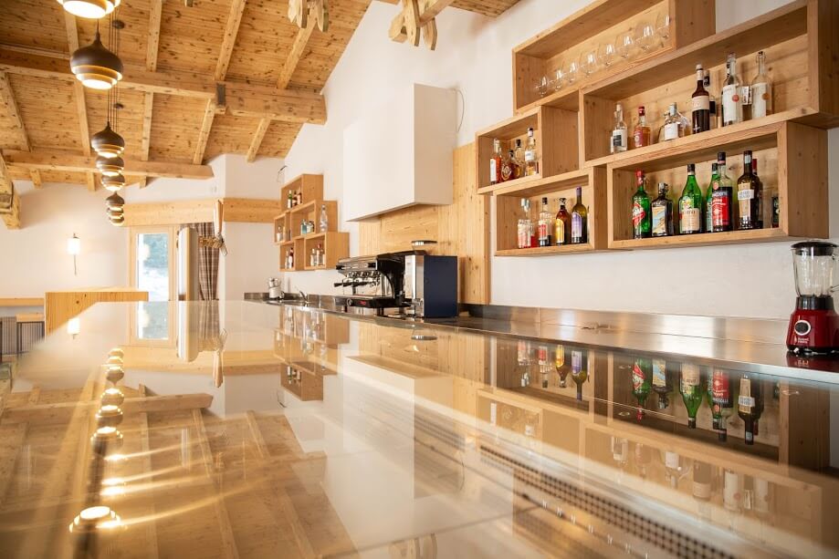 Il secondo step di lavori nella primavera scorsa: è stato effettuato il consistente lavoro di sabbiatura del fabbricato (sul legno) sia degli interni sia degli esterni; poi l’aggiunta dell’arredo, i nuovi serramenti, il lavoro sull’isolamento esterno, e la realizzazione della scala di sicurezza della cucina. Importante anche il lavoro di rivisitazione degli spazi a piano terra del noleggio: sono stati realizzati più spazi per permettere la convivenza del noleggio degli sci e delle biciclette. A questo si aggiunge un ufficio e un locale per il personale di servizio.