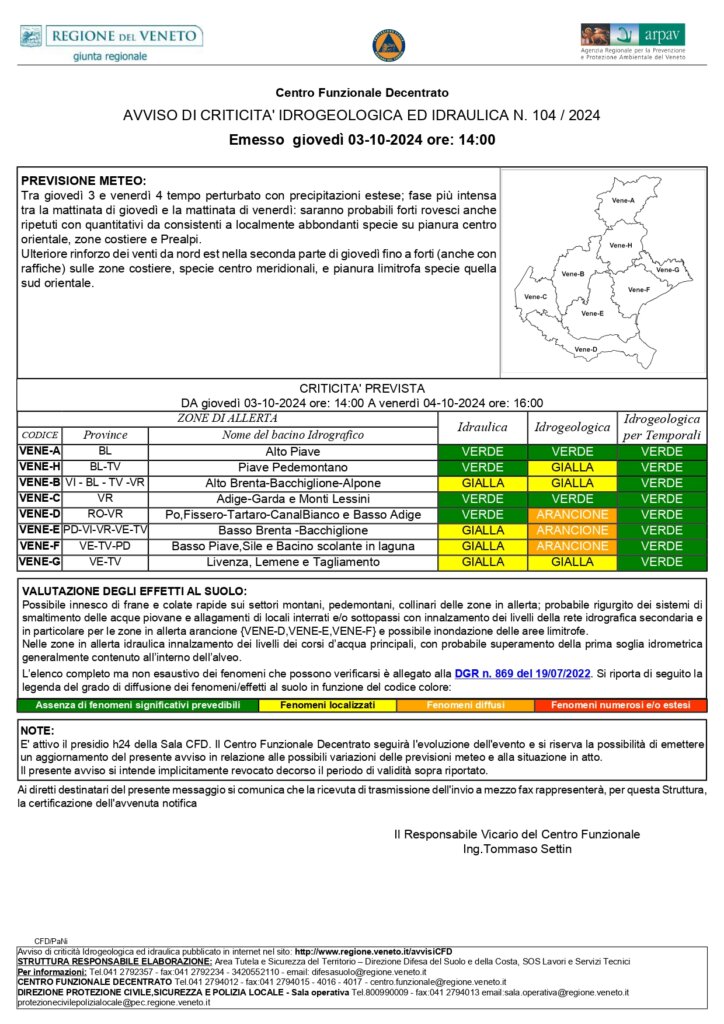 In seguito a queste previsioni, il Centro Funzionale Decentrato della Protezione Civile Regionale ha emesso un avviso di criticità idrogeologica e idraulica, valido dalle ore 14 di oggi fino alle 16 di domani. È stata dichiarata la fase operativa di preallarme (allerta arancione) per criticità idrogeologica nei bacini di Po, Fissero-Tartaro-Canal Bianco, Basso Adige, Basso Brenta-Bacchiglione, e Basso Piave-Sile-Bacino scolante in laguna. È stata inoltre attivata la fase di attenzione (allerta gialla) per i bacini del Piave Pedemontano, Alto Brenta-Bacchiglione-Alpone, Livenza-Lemene-Tagliamento. Per quanto riguarda la provincia di Vicenza, la parte settentrionale è in allerta gialla, il Basso Vicentino (dove molti Comuni hanno attivati i Coc) è in allerta arancione.