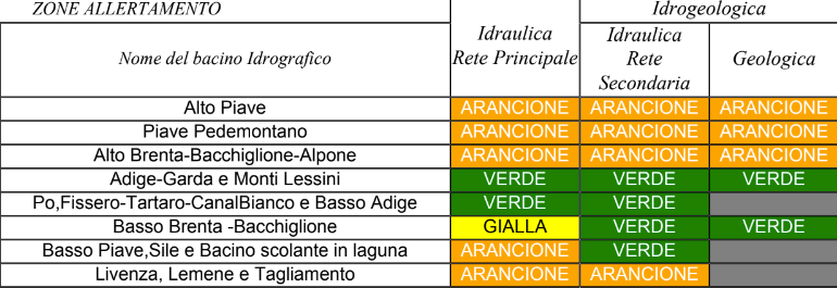 Intanto il Centro Funzionale Decentrato della Protezione Civile del Veneto ha emesso un nuovo avviso di criticità, valido dalle 20.00 di oggi alle 20.00 di domani, dichiarando lo Stato di Preallarme (Allerta Arancione) sui Bacini idrografici Alto Piave, Piave Pedemontano, Alto Brenta Bacchiglione Alpone, Basso Piave Sile Bacino Scolante in Laguna, Livenza Lemene Tagliamento. Lo Stato di Attenzione è stato dichiarato sul Bacino Basso Brenta Bacchiglione.