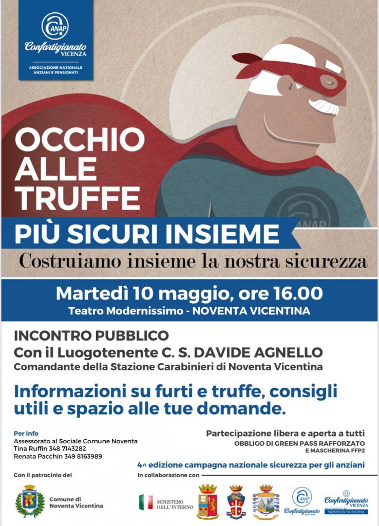 Martedì 10 maggio alle ore 16.00, presso il teatro Modernissimo, si tratterà il tema della sicurezza e soprattutto come evitare le truffe (specie quelle del “porta a porta”, le telefonate commerciali o altre forme furbesche per estorcere soldi).