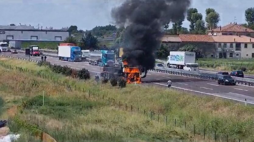 Paura in autostrada: camion a fuoco, traffico bloccato (video e foto)
