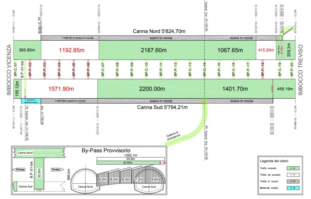 Per il completamento dello scavo rimane nella canna nord un tratto di 415 metri in roccia verso Malo ed un tratto di 1190 metri di terreno sciolto verso Castelgomberto. Nella canna sud, invece, mancano 1570 metri sul lato Castelgomberto in terreno sciolto. La più lunga galleria stradale d’Italia, circa 6 km, sarà completamente scavata entro luglio 2021. Da quella data inizieranno tutte le lavorazioni degli impianti e delle forniture, per giungere all’ultimazione dei lavori a febbraio 2022.