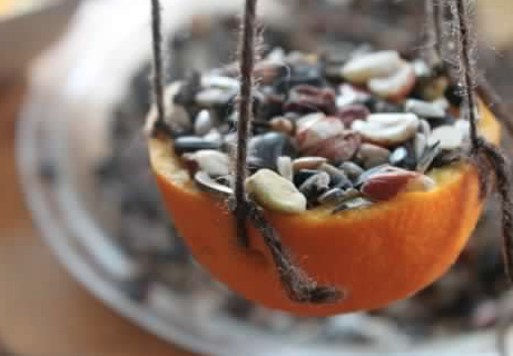 Un’arancia può diventare una mangiatoia per uccellini selvatici. Come? Dividere un’arancia a metà e svuotarne una parte del contenuto, semplicemente facendo una spremuta e ponendo attenzione a non rompere la buccia. La buccia stessa diverrà il contenitore per il vostro mangime per uccelli, da riempire a piacere e da appendere al ramo di un albero con uno spago robusto. Potete anche aggiungere un bastoncino per agevolare gli uccellini.