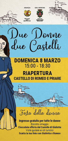 Domenica 8 marzo, “Giornata internazionale della donna”, dalle 15.00 alle 18.30 saranno riaperti le Priare e i Castelli di Giulietta e Romeo, nel segno di un’iniziativa denominata “Due donne, due castelli”: le donne in questione sono Lucina Savorgnan, che Luigi Da Porto nominò in una lunga dedica inserita nella sua “Historia novellamente ritrovata di due nobili amanti”, e la Giulietta cantata da William Shakespeare nella sua famosissima tragedia.
