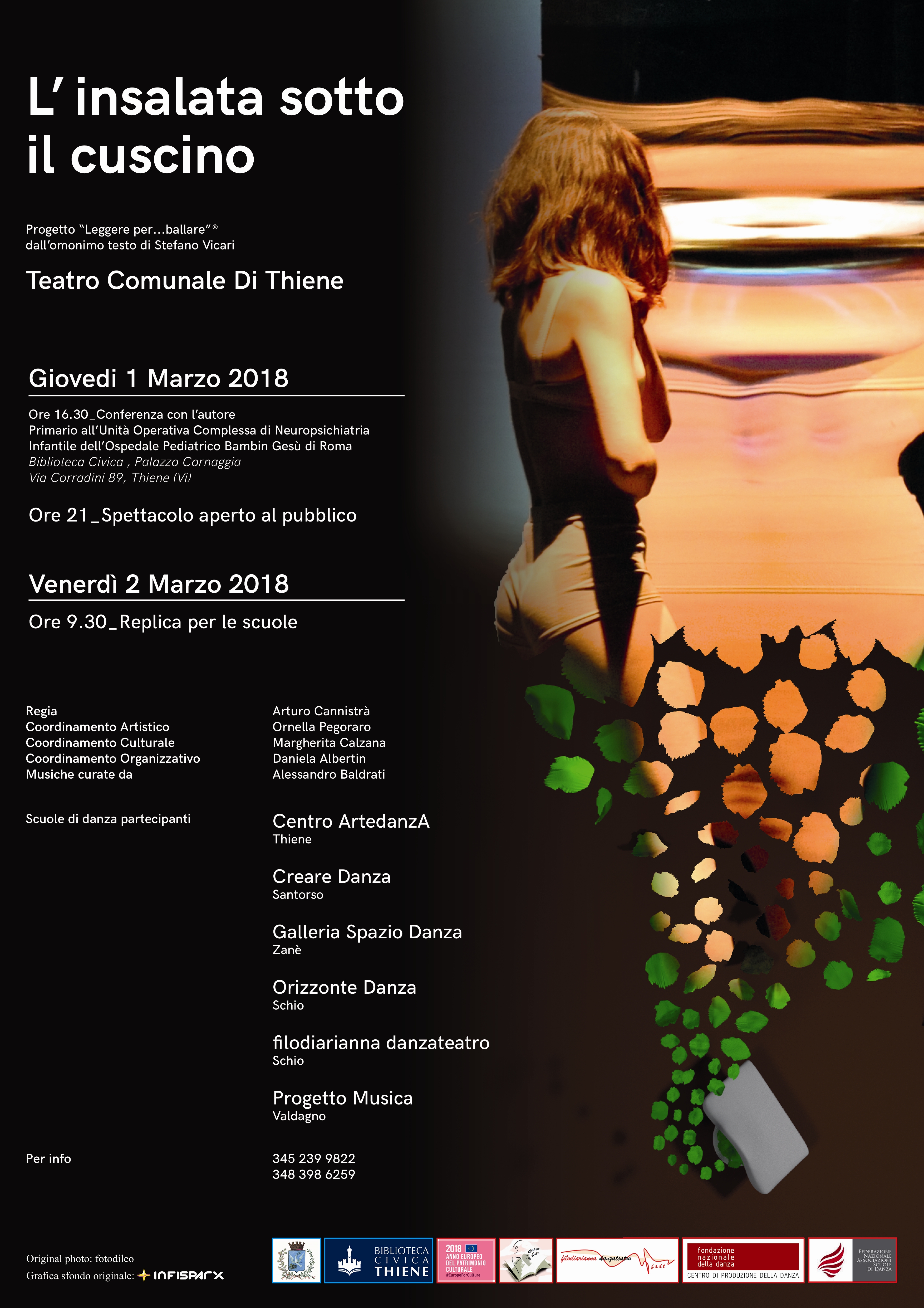 Giovedì 1 marzo e venerdì 2 marzo 2018 la Città di Thiene ospiterà una due giorni su un tema delicato e complesso, ancora poco conosciuto, la sofferenza psichica degli adolescenti. L’iniziativa rientra nel progetto “Leggere per… ballare”® della Federazione Nazionale Associazione delle Scuole di Danza che, in collaborazione con l’associazione Filodiarianna Danzateatro e alcune scuole di danza del territorio, realizza uno spettacolo ispirato al libro “L’insalata sotto il cuscino” di Stefano Vicari, progetto rivolto agli allievi delle scuole medie e superiori. Alla realizzazione dell’iniziativa, che rientra nel novero degli eventi per l’anno Europeo del Patrimonio Culturale (2018) e vede il coinvolgimento degli Istituti Superiori di Thiene, collaborano l’Assessorato alla Cultura e la Biblioteca Civica. Il primo appuntamento è giovedì 1 marzo alle 16.30 in Biblioteca Civica con la conferenza tenuta da Stefano Vicari, Primario dell’Unità Operativa Complessa di Neuropsichiatria Infantile dell’Ospedale Pediatrico Bambin Gesù di Roma, responsabile di progetti di ricerca nazionali e internazionali ed autore di libri per medici, psicologi e terapisti in italiano e in inglese e di oltre cento pubblicazioni scientifiche su riviste di settore. Stefano Vicari tratterà sulla sofferenza psichica degli adolescenti, per conoscere, capire, sapere cosa si può e si deve fare, traendo spunto dai volti, i nomi e le storie più significative raccontate nel suo libro “L’insalata sotto il cuscino”, da cui la Rai ha tratto nel 2013 la prima “docufiction” dedicata a questi temi, una serie in sei puntate dal titolo “Disordini” ed interpretata dallo stesso autore. Anoressia, depressione, schizofrenia, ansia, ossessioni sono i disturbi che affliggono ragazzi ed adolescenti poco più che bambini che nonostante la giovane età si misurano con disturbi spesso invalidanti. Qualcuno potrebbe ritenere che il fenomeno riguardi una esigua minoranza. Purtroppo non è così. Le storie riportate nel libro sono drammatiche e toccanti, ma anche cariche di speranza e costituiscono un aiuto concreto per superare, senza terrorismi, i pregiudizi e ad affrontare con piena consapevolezza la realtà. Sempre giovedì 1 marzo alle 21.00 seguirà al Teatro Comunale lo spettacolo di danza aperto alla cittadinanza. Firmano la regia Arturo Cannistrà, il coordinamento artistico Ornella Pegoraro, responsabile del coordinamento culturale è Margherita Calzana, curatrice del coordinamento organizzativo è Daniela Albertin, le musiche sono proposte da Alessandro Baldrati. All’evento coreutico partecipano le scuole di danza Centro Artedanza di Thiene, Creare Danza di Santorso, Galleria Spazio Danza di Zanè, Orizzonte Danza di Schio, Filodiarianna Danzateatro di Schio, Progetto Musica di Valdagno. Lo spettacolo viene proposto alle scuole superiori nella mattina di venerdì 2 marzo 2018 alle 9.30, sempre al Teatro Comunale.
