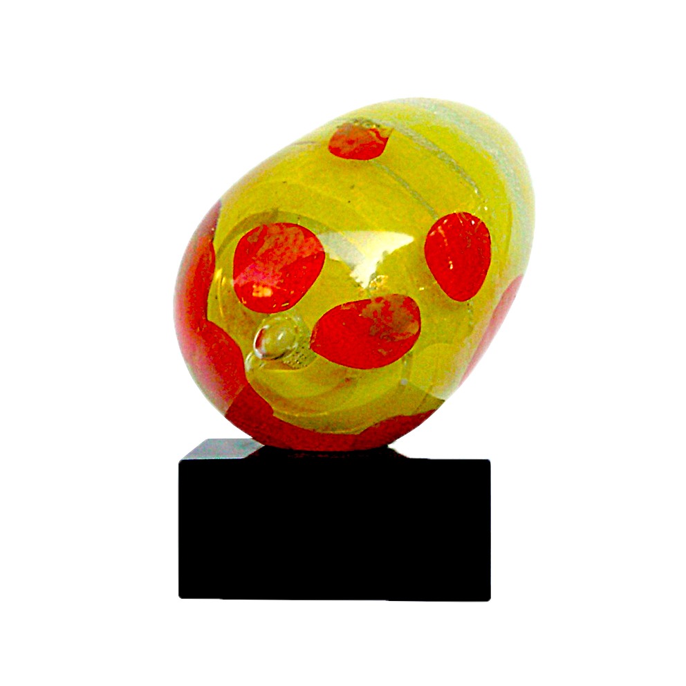 Si tratta di dipinti e sculture in vetro che hanno come soggetto l’uovo, motivo costante della ispirazione dell’artista ma anche della filosofia culinaria di Cracco, che all’uovo ha dedicato persino un libro monografico.