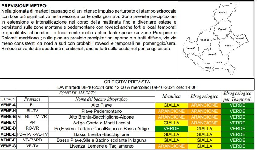 Il Centro Funzionale Decentrato della Protezione Civile del Veneto, alla luce delle previsioni meteo avverse a partire da domattina, ha emesso un avviso di criticità idrogeologica e idraulica, valido dalle ore 12.00 di martedì 8 ottobre 2024 alle ore 14.00 di mercoledì 9 ottobre, in cui si dichiara: