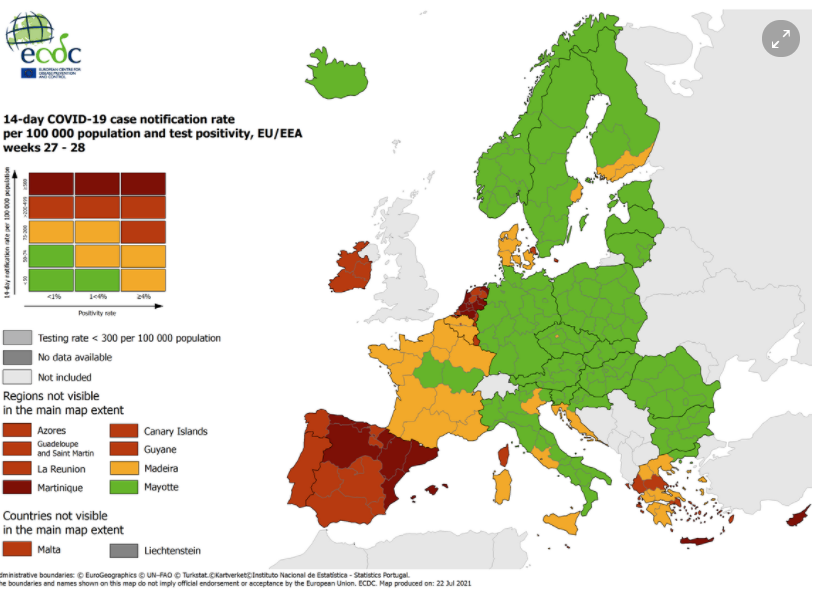 Il passaggio alla zona gialla nella mappa europea dipende dal netto aumento dei contagi negli ultimi giorni. Più di 800 nelle ultime 24 ore.