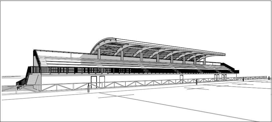Per consentire la protezione dalle intemperie dell’intera area delle tribune, saranno aggiunti due pilastri ai sei già esistenti e predisposti per il montaggio della copertura. La struttura sul retro sarà invece interrotta in corrispondenza delle due campate previste dal progetto, allo scopo di creare un gioco prospettico più leggero e di dare luce ai quattro spogliatoi, situati al piano terra della tribuna, con docce e bagni, alcuni locali di servizio e la centrale termica.