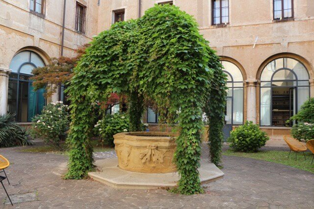 L’antico manufatto ricavato da un unico blocco di pietra di Nanto, risalente presumibilmente tra fine Seicento e primo quarto del Settecento, è situato al centro del chiostro, un giardino pensile a pianta quadrangolare accessibile dalla sala di studio della biblioteca di Palazzo San Giacomo. Il restauro si è rivelato delicato e complesso a causa del pessimo stato di conservazione e all’erosione della pietra, che ha compromesso la decorazione ad alto rilievo composta da un’alternanza di cornici e foglie d’acanto.