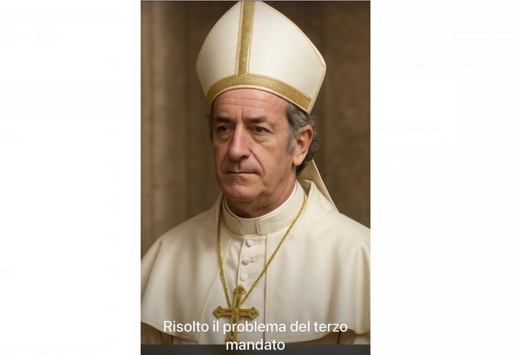 VENEZIA – Altro che terzo mandato, qui si punta direttamente al soglio pontificio. In un tripudio di Photoshop e ironia social, sta facendo il giro del web un meme che ritrae il presidente della Regione Veneto, Luca Zaia, vestito da Papa, completo di mitria e pastorale, con sotto la didascalia: “Risolto il problema del terzo mandato”.