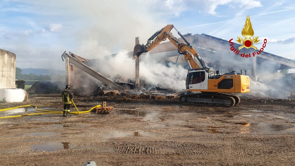 Proseguono le operazioni di spegnimento dell’incendio fienile divampato nel pomeriggio di mercoledì in un’azienda agricola a Pozzoleone, che ha coinvolto una struttura di deposito di oltre 2500 rotoballe di fieno per un totale di oltre 10.000 quintali. Durante la notte sono continuate le operazioni di spegnimento con le squadre dei vigili del fuoco di Bassano del Grappa e i volontari di Thiene. Sono ora in corso le operazioni di smantellamento del capannone di cemento armato pericolante per i danni subiti dall’incendio. Successivamente le squadre procederanno con le operazioni di estinzione e bonifica, della grande quantità di foraggio contenuto nella struttura. Le operazioni dei vigili del fuoco proseguiranno presumibilmente per tutta la giornata di oggi.