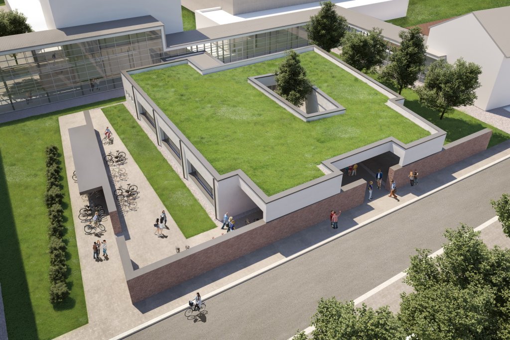 Si cerca di mantenere il più possibile le alberature presenti. Dove necessario, per necessità di illuminazione, le piante vengono sostituite con arbusti più bassi. Sempre a proposito di verde, la copertura sarà finita con un tetto verde a giardino pensile estensivo.