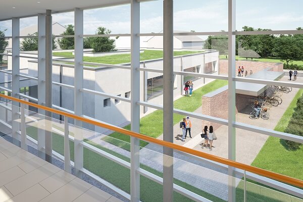 Un corridoio vetrato collega le aule esistenti all’ampliamento.