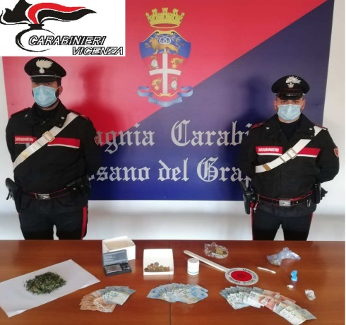 Nel corso della perquisizione personale, estesa poi all’abitazione dello ZANOTTO, i carabinieri hanno rinvenuto e sequestrato oltre 80 grammi fra hashish, marijuana, cocaina, un bilancino, oltre 1000 euro in banconote da 50, 20 e 10, ritenuto provento della sua attività illecita e materiale da taglio, il tutto posto sotto sequestro. Il giovane, che non esercita alcuna lecita attività lavorativa, è stato arrestato per spaccio e detenzione ai fini di spaccio di sostanza stupefacente e su disposizione del P. M. di turno – dott. Giovanni Parolin – della Procura della Repubblica di Vicenza è stato tradotto presso la propria abitazione in regime di arresti domiciliari, in attesa dell’udienza di convalida e contestuale giudizio direttissimo innanzi al Tribunale di Vicenza. Il suo accompagnatore sarà segnalato alla Prefettura di Vicenza quale assuntore per l’irrogazione delle previste sanzioni amministrative. Ad entrambi sarà contestata la violazione prevista dal DPCM –Sars Cov 2, per essere usciti dalla propria abitazione oltre l’orario consentito.